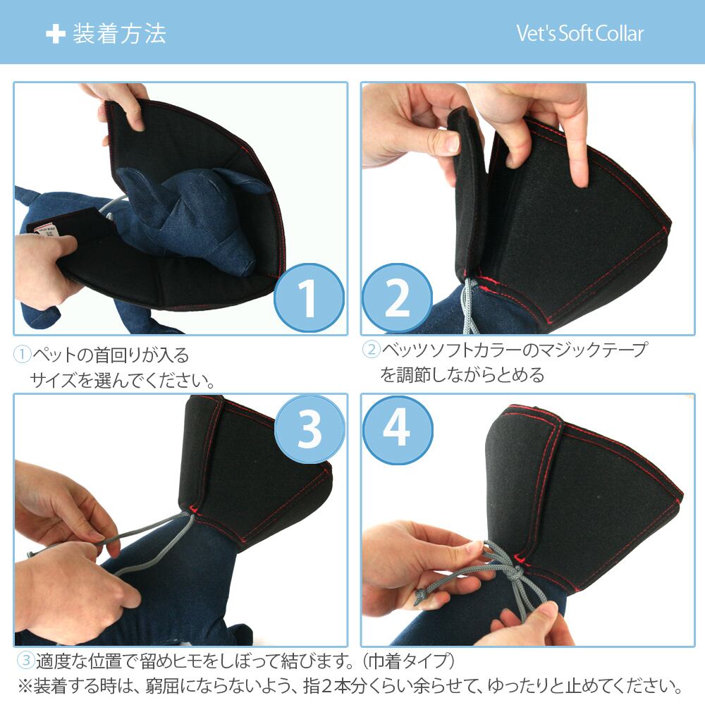 ペットの首に通し、ひもで適度なサイズまでしぼり(きんちゃくタイプ)