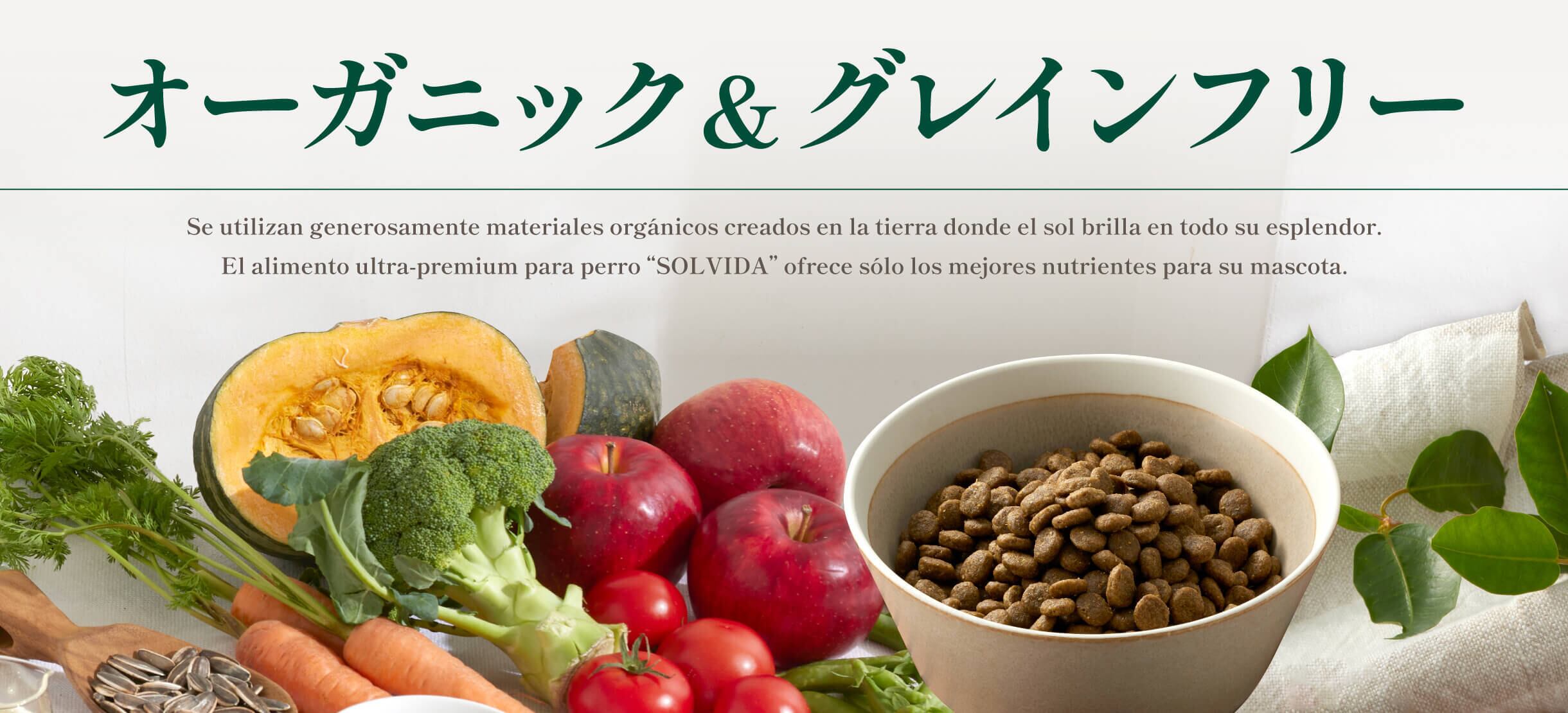 自然の中でのびのび育ったオーガニックチキンをたんぱく源のベースとして使用し、オーガニック野菜やフルーツをバランスよく配合しています。SOLVIDA全シリーズにおいて、原材料の70%以上に厳しい基準をクリアしたオーガニック食材を使用しています。