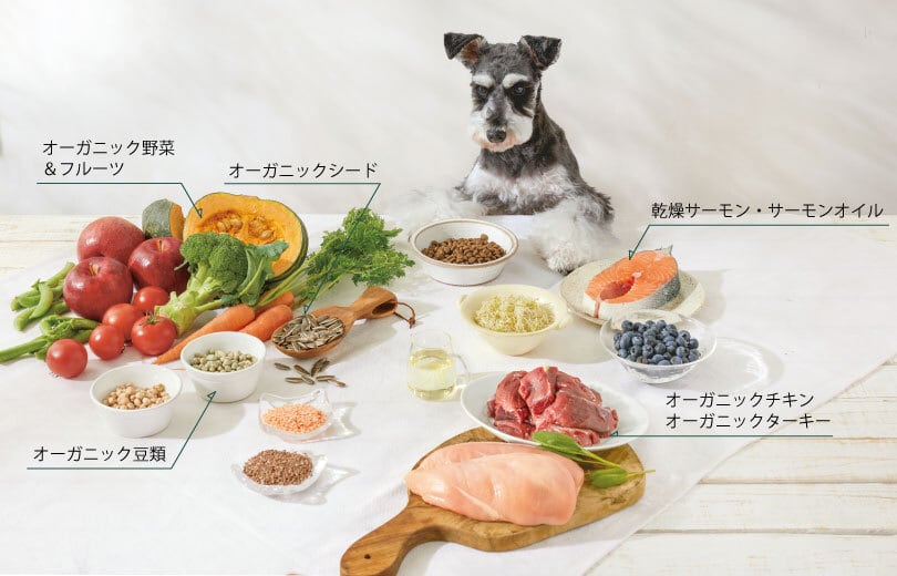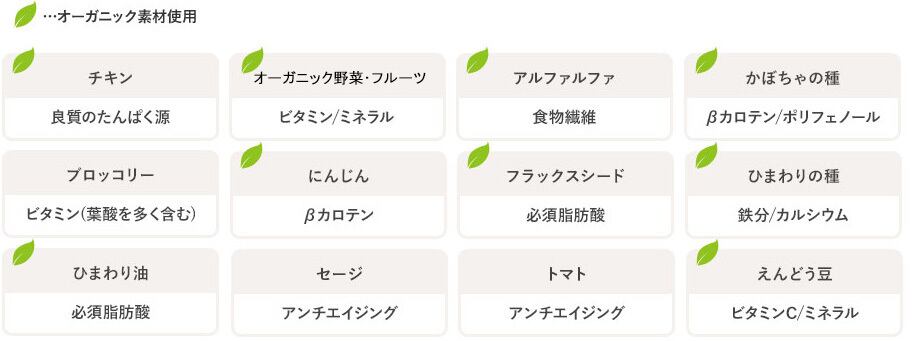 オーガニックチキン生肉、乾燥チキン、オーガニック乾燥豆類、オーガニックエンドウ豆粉、オーガニックエンドウ豆プロテイン、オーガニック乾燥ヒヨコ豆、オーガニックタピオカ粉、オーガニック乾燥アルファルファ、オーガニックひまわり油*、天然フレーバー、オーガニック挽き割りフラックスシード、オーガニック乾燥ジャガイモ、鶏脂肪*、乾燥サーモン、エンドウ豆でんぷん、サーモンオイル*、乾燥トマト繊維、乾燥レンズ豆、乾燥ビール酵母、タウリン、オーガニックひまわりの種、乾燥かぼちゃ、乾燥ブルーベリー、オーガニック乾燥にんじん、乾燥ブロッコリー、オーガニック乾燥大豆、加水分解酵母(マンナンオリゴ糖源)、乾燥チコリ根(イヌリン、フラクトオリゴ糖源)、乾燥セージ、乳酸、ユッカフォーム抽出物、ガーリックパウダー、ミネラル類(食塩、塩化カリウム、プロテイネイテッド亜鉛、プロテイネイテッド鉄、プロテイネイテッド銅、プロテイネイテッドマンガン、ヨウ素酸カルシウム、セレニウム酵母)、ビタミン類(塩化コリン、ビタミンE補助食品、ナイアシン補助食品、ビタミンB1硝酸塩、D-パントテン酸カルシウム、ビタミンA補助食品、ビタミンB6、リボフラビン補助食品、ビタミンD3補助食品、ビオチン、ビタミンB12補助食品、葉酸)、プロバイオティクス微生物(イースト菌、乳酸菌、麹菌、糸状菌、枯草菌)、酸化防止剤(ミックストコフェロール)*ミックストコフェロールで保存