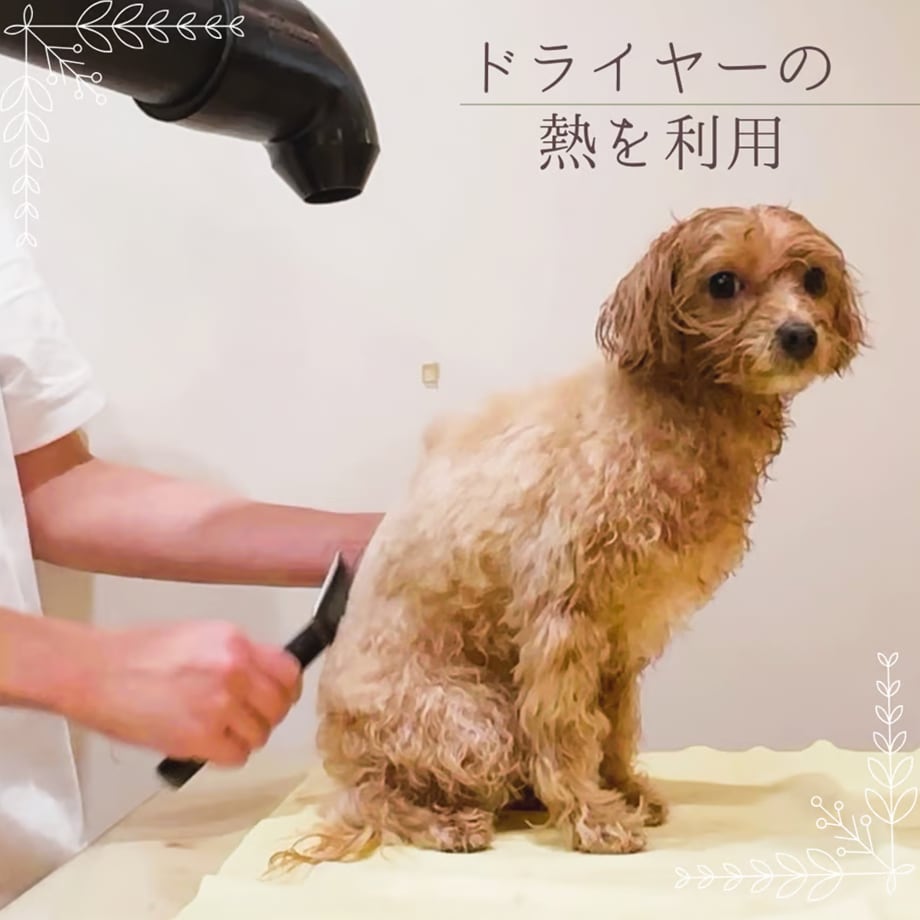 1、ヘアケア化粧品注目成分「エルカラクトン」配合。ドライヤーの熱を帯びることでタンパク質と結合し被毛の表面に幕を作り、剝がれたキューティクルを閉じダメージを補修します。ドライ前に使うのがおすすめです。